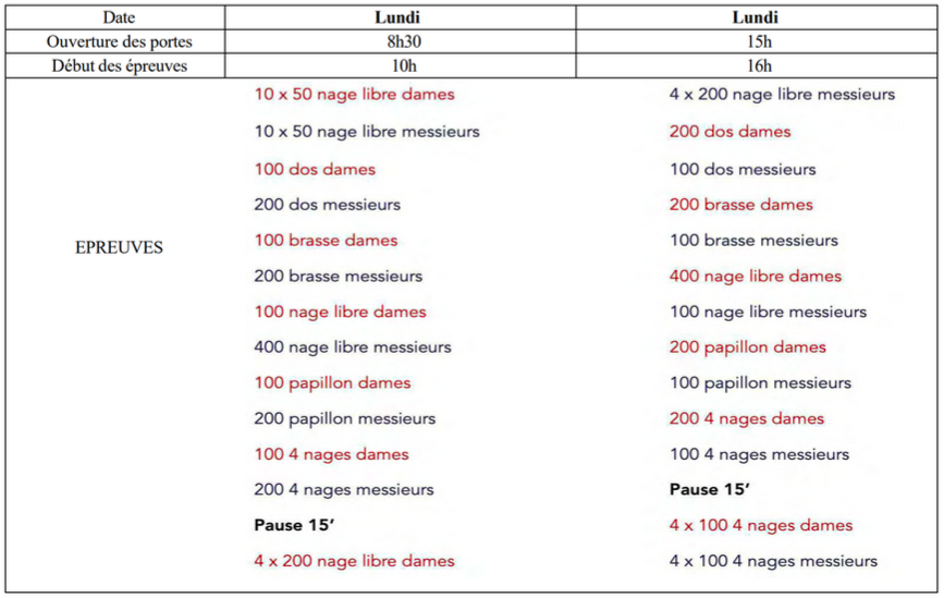 Attention, tous les nageurs doivent être présent dès le matin pour le relais 10x50NL. L'absence d'un nageur entraîne le déclassement de l'équipe entière.
