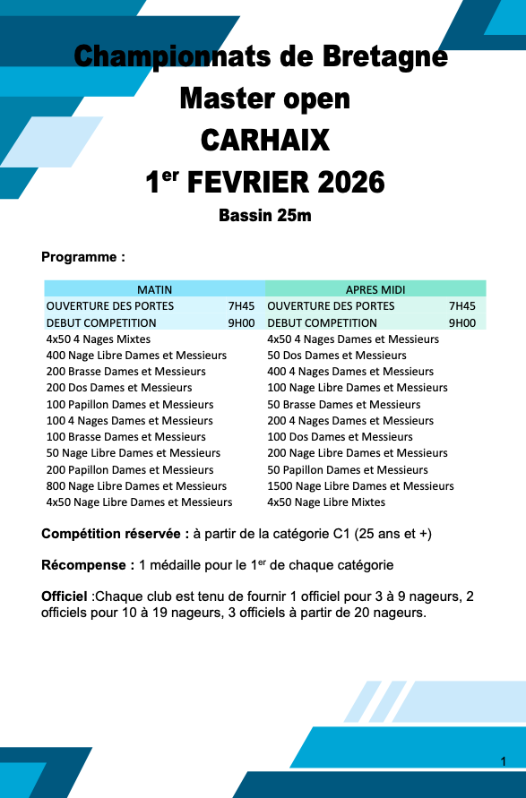 Le championnat RÉGIONAL des maitres en bassin de 25m aura lieu à Carhaix le 1° Février.